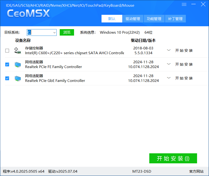 CeoMSX 是一款主要在 PE 环境下使用的工具,用于给 C 盘系统导入必备驱动。它支持以下驱动的导入:SRS(磁盘控制器 IDE、AHCI、RAID、NVME)、XHCI(USB3.x)、IO(特殊键盘、鼠标、触控板等设备的依赖驱动)、触控板、键盘鼠标、Net(网卡)。用户可以使用 CeoMSX 给当前系统(PE)安装驱动,以满足系统对驱动的需求。CeoMSX 支持多个版本的驱动选择,用户可以通过点击驱动日期右边的向下箭头来显示不同版本的驱动,并自由选择所需版本。