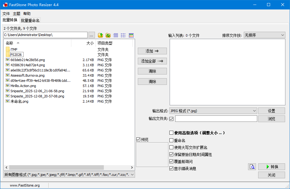 FastStone Photo Resizer 是一款强大的图片批量处理工具,能够快速地调整图片大小、重命名、转换、水印等操作,支持多种图片格式。