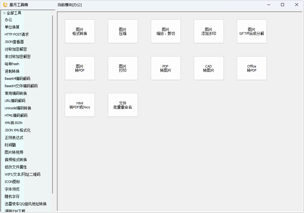 星月工具箱是一款面向 Windows 平台的全能型离线办公与开发辅助工具集,主打轻量化、多功能整合,核心服务于办公人群、程序员及设计爱好者。