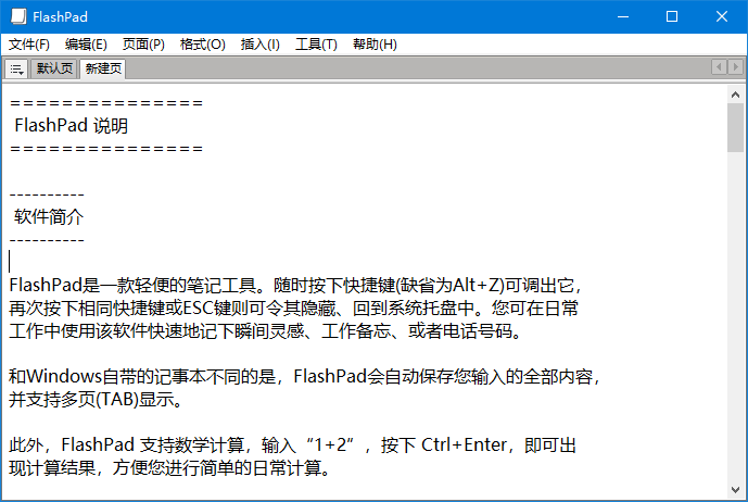 和Windows自带的记事本不同的是,FlashPad会自动保存您输入的全部内容,并支持多页(TAB)显示。