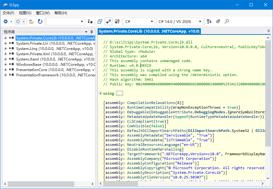 ILSpy 能够使用 C# 在 C#,IL 和 IL 中呈现代码。对于 C#,您可以选择 C#1.0/VS .NET 到 C#7.2/VS 2017。例如,您可以查看资源和引用,查看表以及将信息提取到文件。