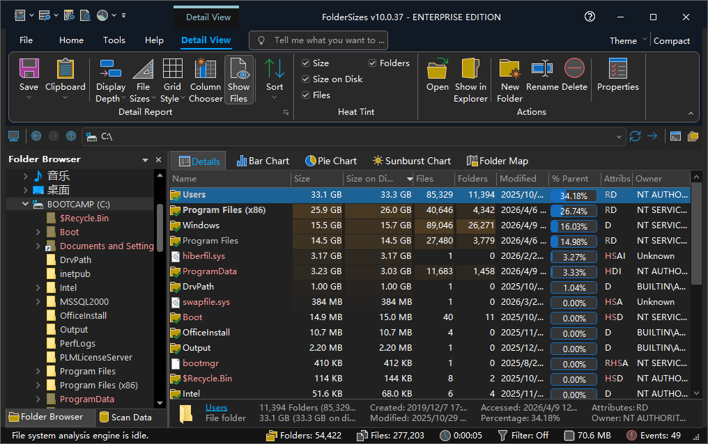 提供图表显示功能,直观展示文件夹大小和占用情况。