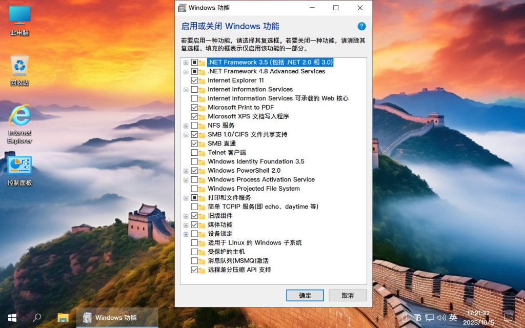 保留组件:语音识别TTS、IIS、XBOX、打印、蓝牙、指纹、共享、微软账户、搜索、计算器、相机、照片、屏幕投影、平板模式、BitLocker、远程桌面、NFS 、IE浏览器、画图、截图、防火墙、WMP、旧版组件 、Linux、Telnet
