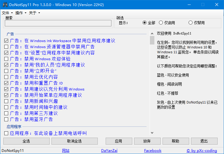 隐私设置:DoNotSpy11允许用户定制Windows 10的隐私设置,包括禁用一些可能收集个人信息的功能。