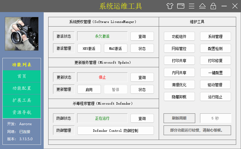 系统运维管理,是一款免安装的电脑维护工具,支持修复常见的电脑故障、.net/vc运行库下载、IP修改、硬件检测、打印共享、文件加密、图种制作,优盘写入保护等。也集成了部分实用的第三方工具,系统激活(HEU、MAS)、关闭更新(wub)、关闭Defender(dControl)、清理优化(HiBit)等